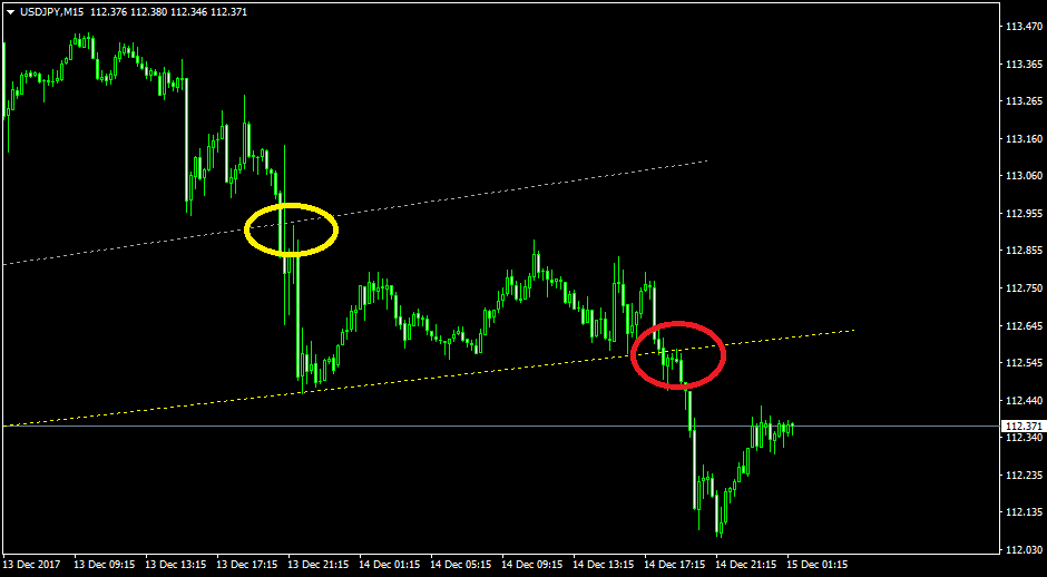ずっと右肩上がり気味のチャネルとも言えるような言えないようなレンジが続き、やっと動き出したのが先ほどの黄色ラインのブレイク。すでに1:30を回っていました。